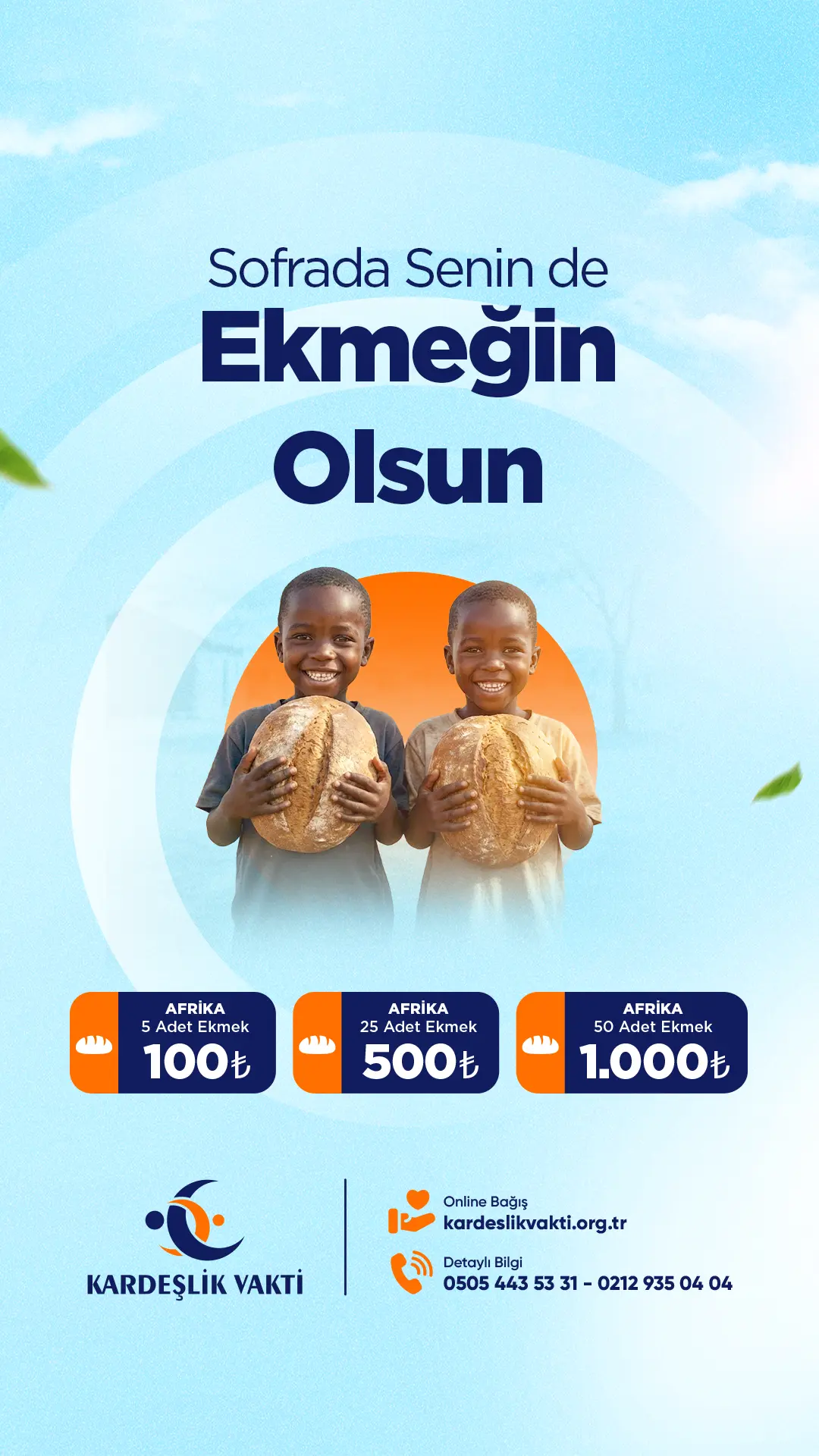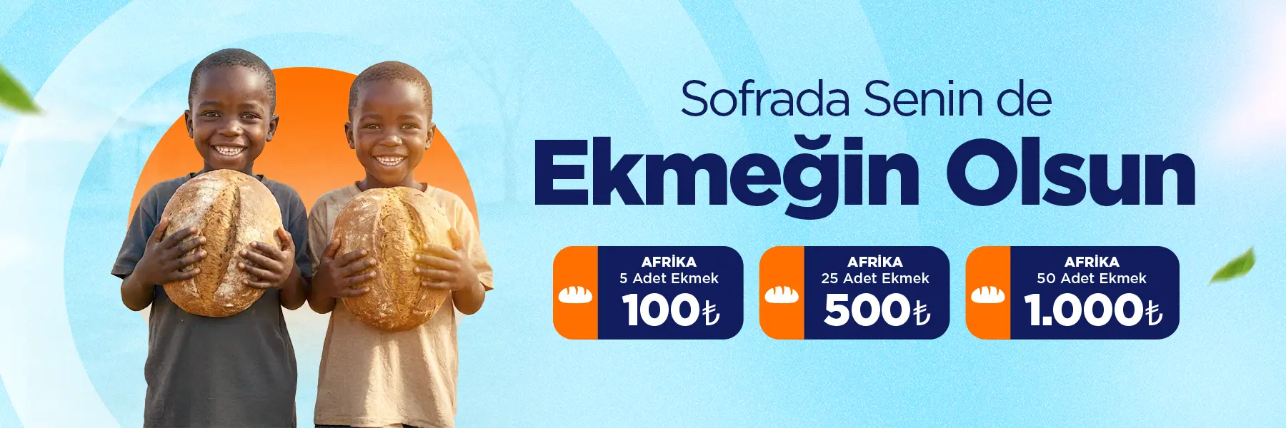 Siz de Afrika’nın zorlu hayat koşullarında yaşamak zorunda kalan, hayatları çeşitli zorluk ve sıkıntılar içinde mücadele içinde geçen Afrrikalı kardeşlerimizin sofrasındaki bir günlük ekmeği bağışlayarak bu hayra ortak olabilir ve amel defterinize bu hayrı yazdırabilirsiniz bir ailenin günlük ekmek ihtiyacı bedeli 100 tl’dir