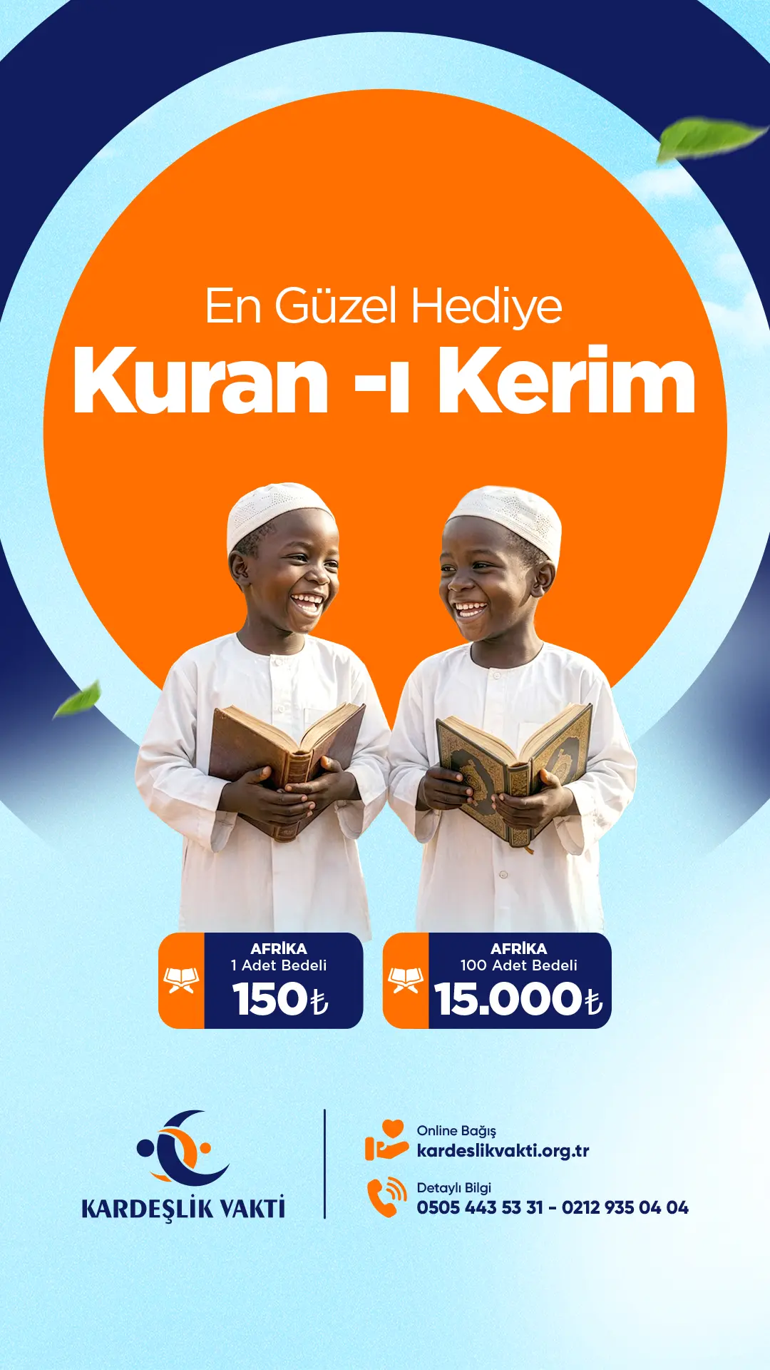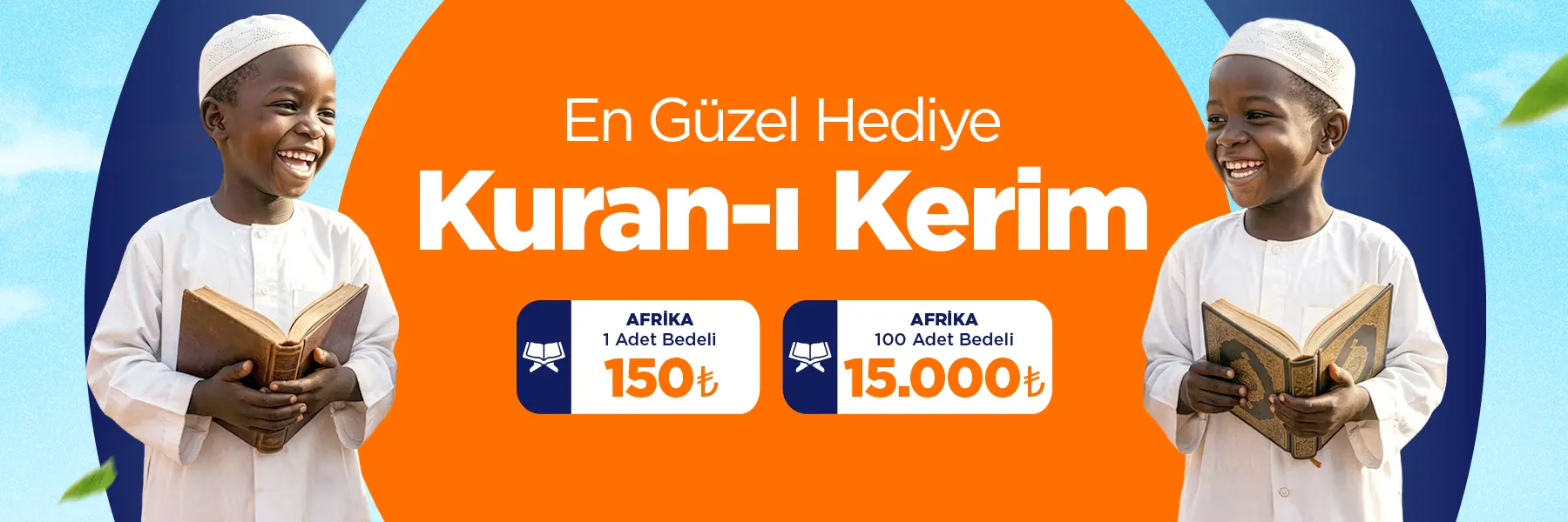 Afrika’da açlık yoksulluğa rağmen ilim yolunda gayret gösteren geleceğin hafızlarına yüce kitabımız Kur’an-ı Kerimi hediye ediyoruz. Bölgede yaşanan kuraklık ve yoksulluk nedeni ile Kur’an eğitiminde zorluklar yaşayan yavrularımıza Kur’an hediye ederek bu hayra ortak olabilir amel defterinize bu hayrı yazdırabilirsiniz. Bir Kur’an-ı Kerim hediyesi 150 ₺’dir.