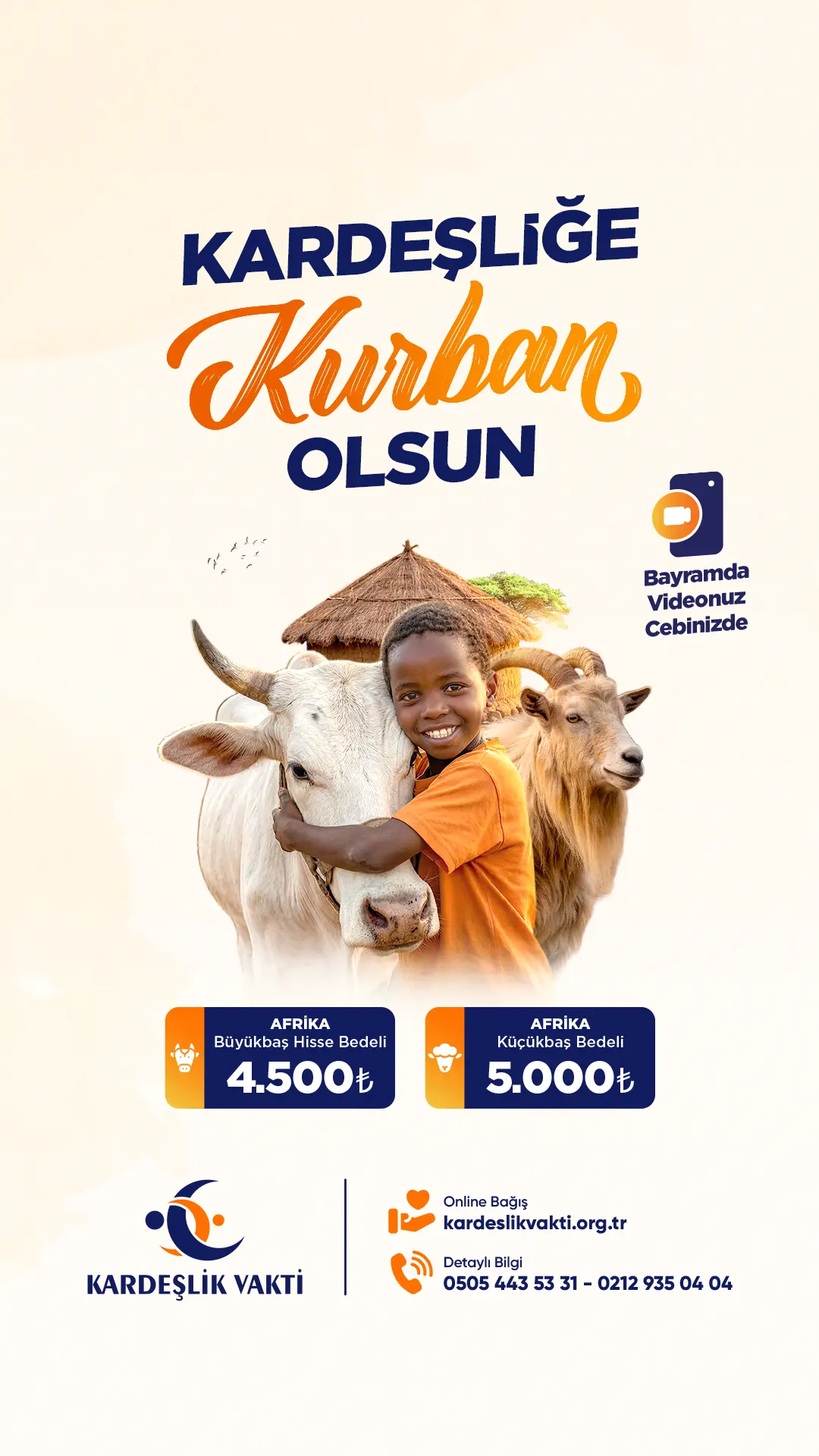 Afrika, bulunduğu coğrafya itibari ile açlığın yoksulluğun ve çeşitli sıkıntıların yoğun olduğu bir bölge. Afrika’da yaşayan kardeşlerimiz açlık, yoksulluk ve çaresizlikle mücadele ederken yeteri kadar sağlıklı ve temiz gıdaya ulaşamıyor ve buna bağlı olarak özellikle çocuklar ve yaşlılar olmak üzere çeşitli hastalık ve sıkıntılarla mücadele etmek zorunda kalıyor, Kardeşlik Vakti Derneği yıl boyunca düzenlemiş olduğu Afrika kurban bağışı organizasyonu ile bölgedeki ekibi tarafından önceden tespit edilen ihtiyaç sahibi aileler ile medrese talebeleri ve yetimhanelere kurban bağışlarınızı bölgedeki ekibi vasıtası ile aracısız ilk elden 24 saat içinde ulaştırıyor. Siz de Afrika kurban bağışında bulunarak bizden kilometrelerce uzakta bir sıcak yemek bulmakta zorlanan kardeşlerimizin sofralarında gönüllerinde neşe olabilirsiniz. Vacip kurban bağışı 2026 bedeli 4.500 Tl’dir. Kesilen kurbanlarınızın kesim videoları bayram günleri içinde tarafınıza whatsapp aracılığıyla iletilmektedir.